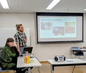 二人は、今は、京都市東山区の本町エスコーラ(古い空家を改修し、コミュニティスペースと住居、アトリエなどとして利用し活動する場所。エスコーラは学校の意味)に住んでいて、バザーロやお祭りなどに参加。Lucasさんは庖丁研ぎを披露した。また、二人でエスペランティストを頼り、日本各地を訪れたそうだ。北海道の札幌のイベント(komuna seminario)に参加したり、礼文島の有名なユースホステルに泊まって自然の美しさを満喫したり、登別温泉の地獄祭りで鬼踊りを見たり、四国では、シンガポール出身のエスペランティスト、エビーナさんに三味線を教えてもらったり……。また、Lucasさんはエスペランティストの自転車グループに所属していて、琵琶湖一周にも参加したそうだ。